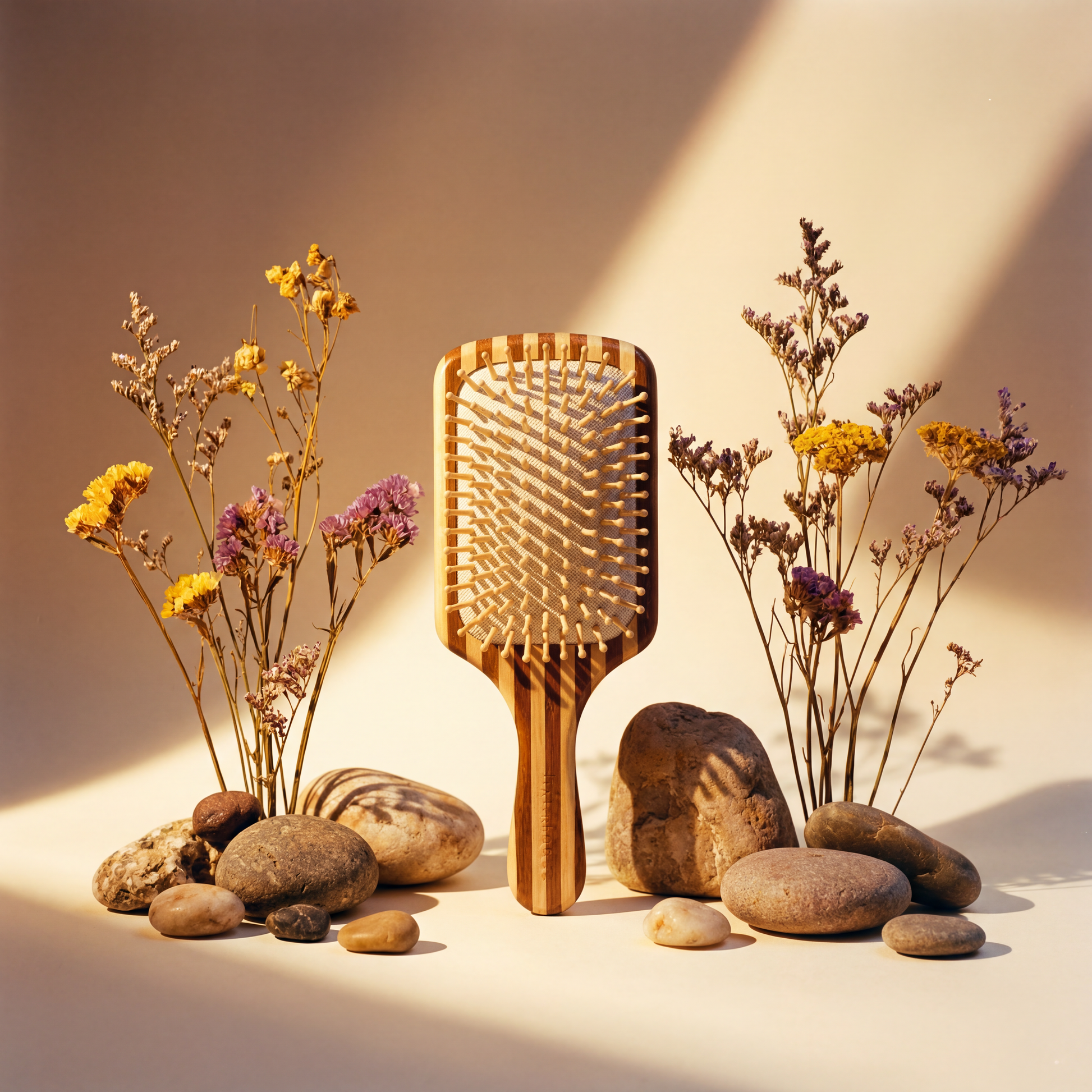 Carved from 100 % sustainable bamboo, this brush honors both hair and planet — combining form, function, and integrity. Its rounded bristles glide effortlessly through the strands, detangling without tension while stimulating micro-circulation across the scalp.