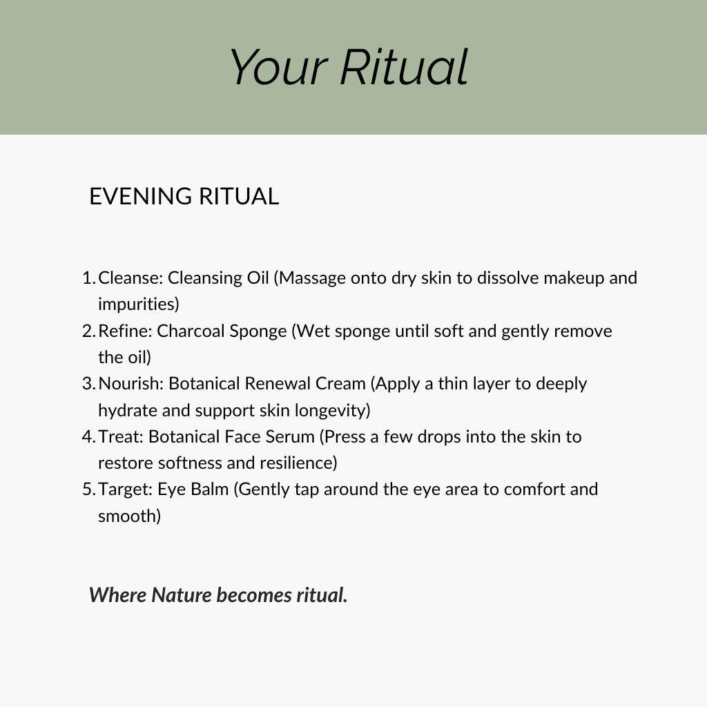 Cleansing Oil → Charcoal Sponge → Botanical Renewal Cream → Botanical Face Serum → Eye Balm